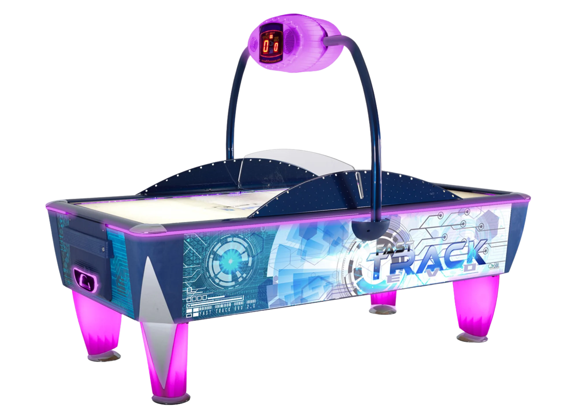 La mesa de aire FAST TRACK 220 EVO 2 de SAM da un paso más en la evolución del air hockey con un nuevo diseño, iluminación LED (ahora también en el campo de juego) y otras nuevas prestaciones.