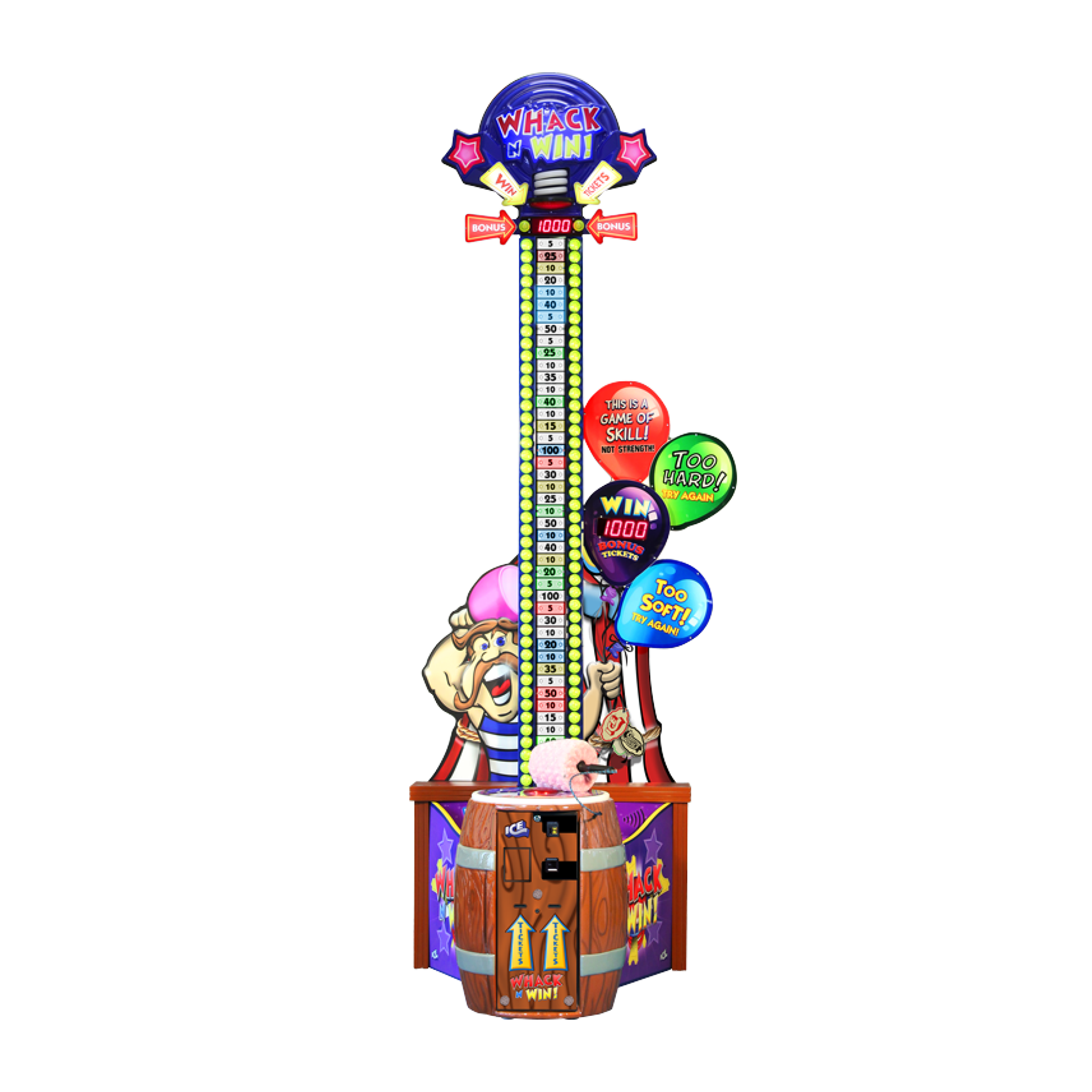 Este juego redemption estilo feria es intuitivo, desafiante y gratificante. Ábrete paso hasta la Zona de Victoria golpeando el sensor con el martillo de espuma. ¡Se trata de habilidad, no de fuerza! ¿Crees que tienes lo necesario? Whack N’ Win es divertido para jugadores de todos los niveles y es el complemento perfecto para tu sala de juegos, sala de juegos o centro de entretenimiento familiar.